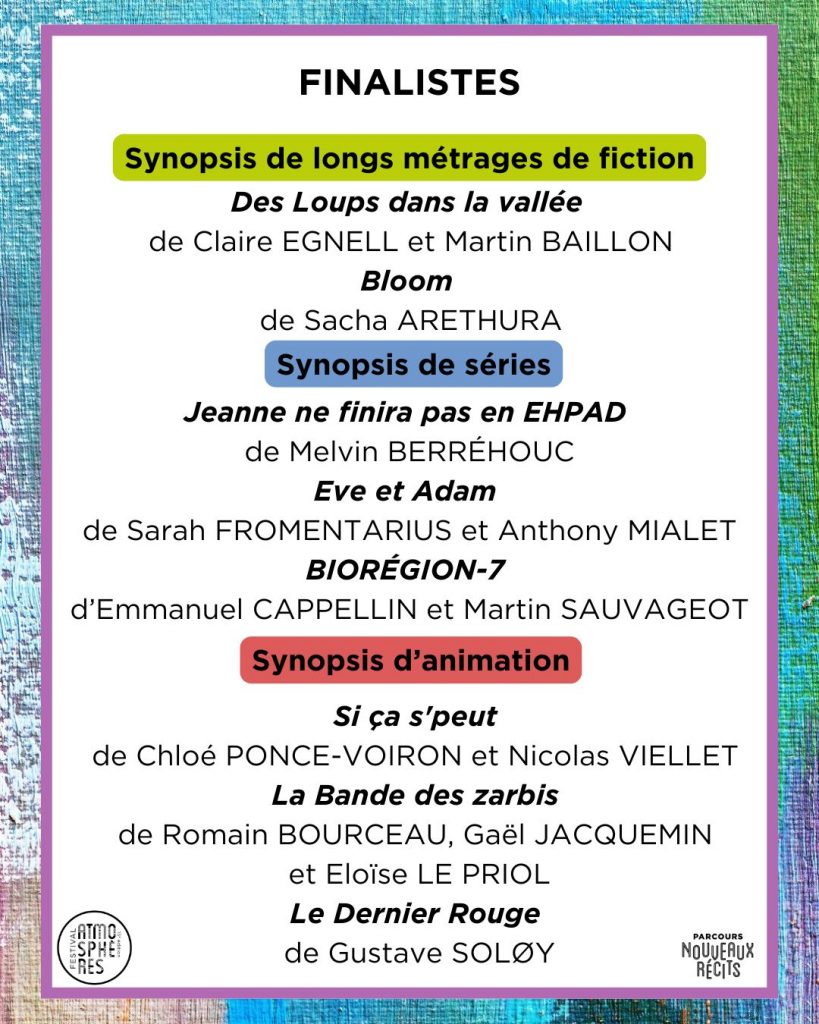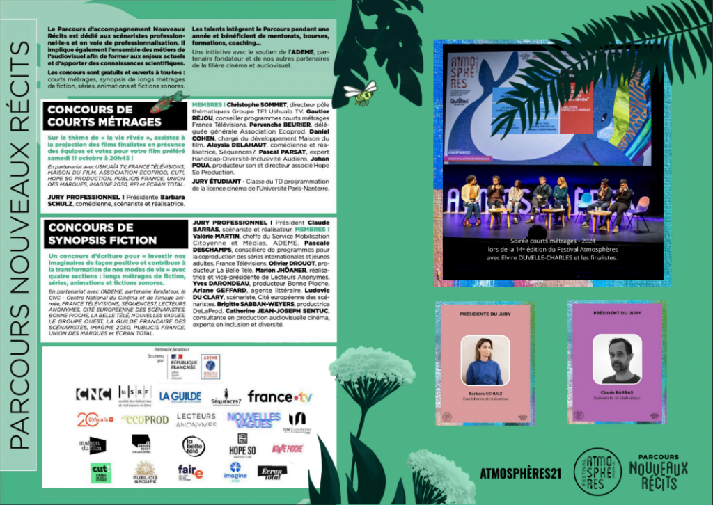 Avec notre partenaire fondateur l’ADEME (Agence de la transition écologique) et nos autres partenaires de la filière professionnelle, le Festival Atmosphères propose un Parcours d’accompagnement Nouveaux Récits dédié aux auteurs-scénaristes, aux conseillers éditoriaux et plus largement à l’ensemble des métiers de l’audiovisuel afin de former et de créer un dialogue constructif avec tous les acteurs de la chaîne de production.